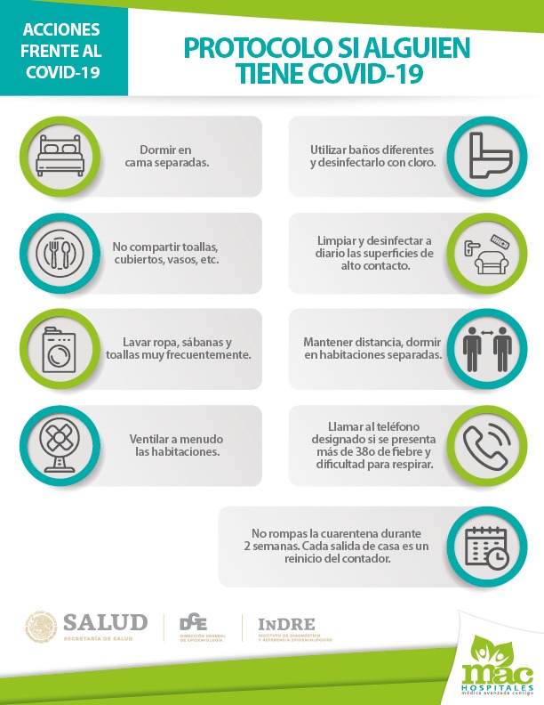 En caso de tener en casa pacientes sospechosos o enfermos con COVID-19, dijo, se deben seguir estas mismas medidas de manera estricta, además de permanecer aislado en una habitación donde esté solo, que esté bien ventilada, con la puerta cerrada y, si es posible, que cuente con baño propio; si el baño es compartido, realizar limpieza y desinfección después de cada uso.